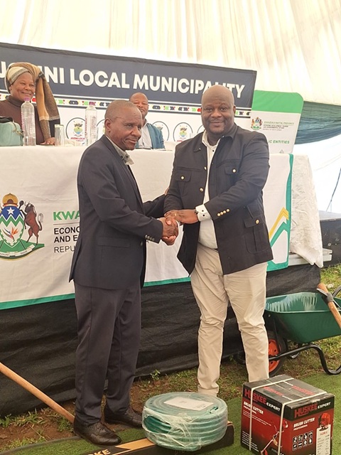 The programme began with a symbolic tree-planting ceremony at Nyathini Primary School, which set the tone for the day’s activities. The initiative was spearheaded by Mr Nkosinathi Scelo Myeni, Mayor of Jozini Local Municipality, who planted the first indigenous tree alongside EDTEA representatives, Principal of Nyathini Primary School, and municipal officials. This act demonstrated a commitment to restoring local ecosystems and promoting the growth of native plant species in the area.